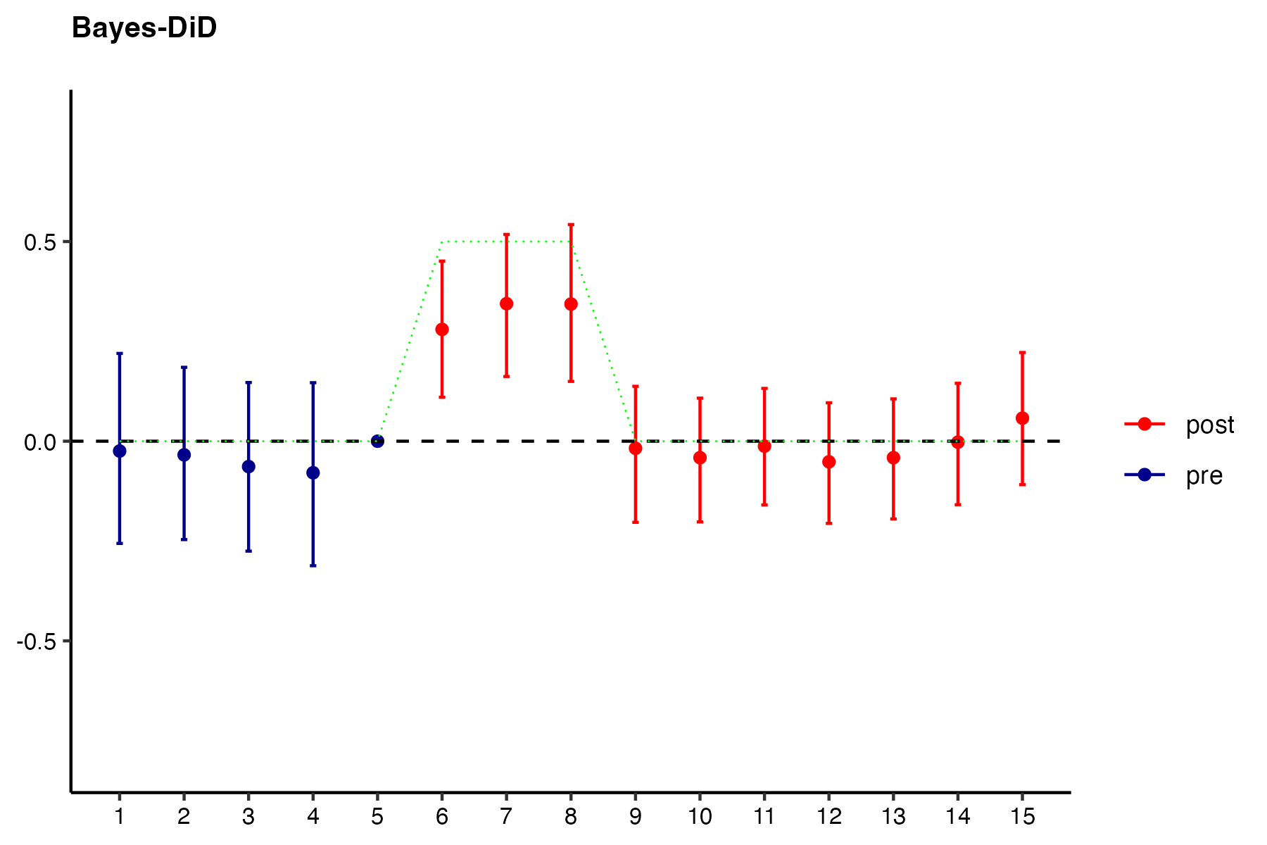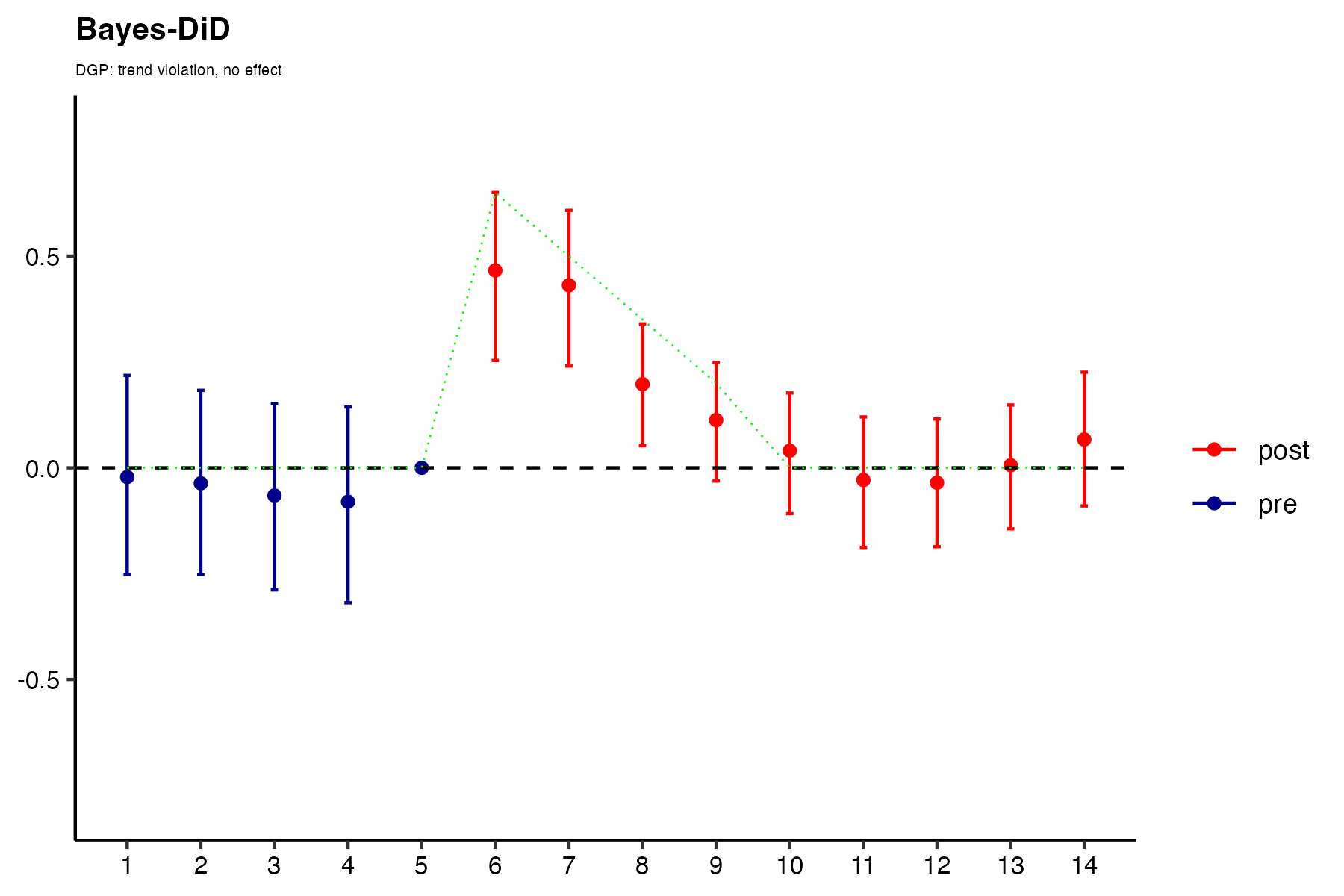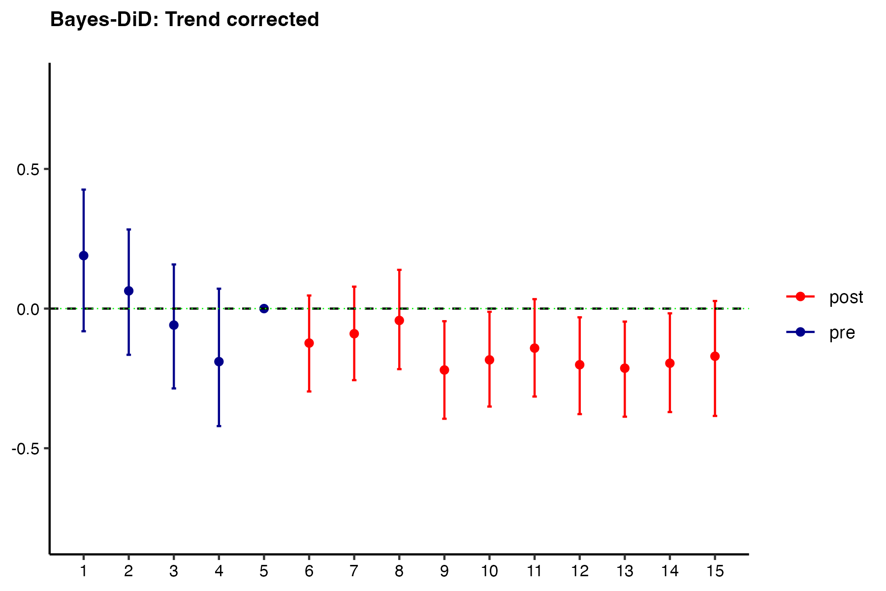 Corrected by implied violation based on posterior-median of pre-treatment model (similar to Rambachan and Roth 2023)
